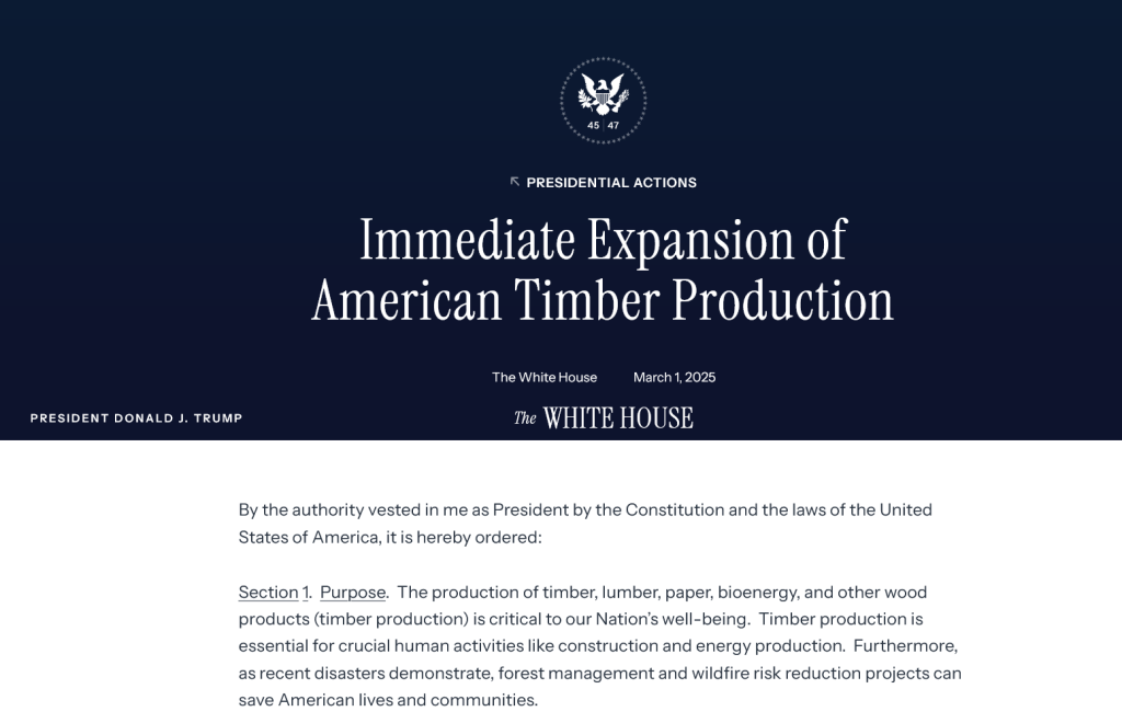 The White House ordered a big push to cut more American timber (wood) from U.S. lands to boost jobs, lower housing and energy costs, reduce wildfires, and stop relying on foreign wood. It speeds up permitting, cuts red tape, and updates environmental rules to make timber harvesting faster and easier